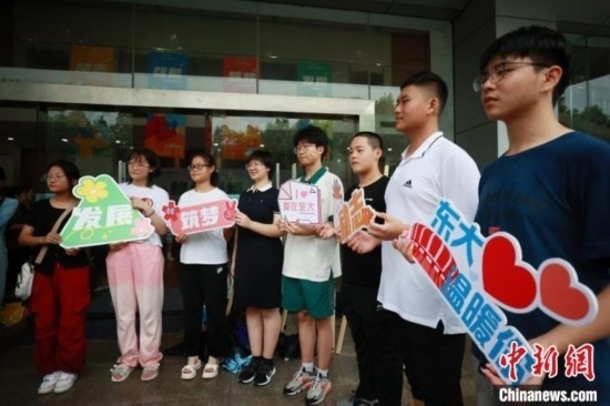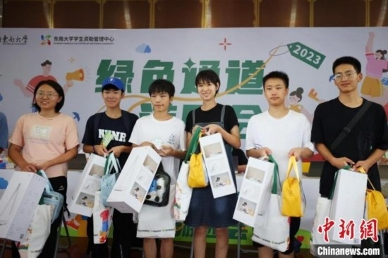 東南大學(xué)迎來(lái)4117名本科新生,在設(shè)立的綠色通道處,師生們合影。泱波 攝