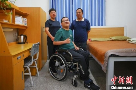 來(lái)自江蘇啟東的董亦超前來(lái)東南大學(xué)報(bào)到,坐在輪椅上的他在父母的陪同下入住宿舍。泱波 攝