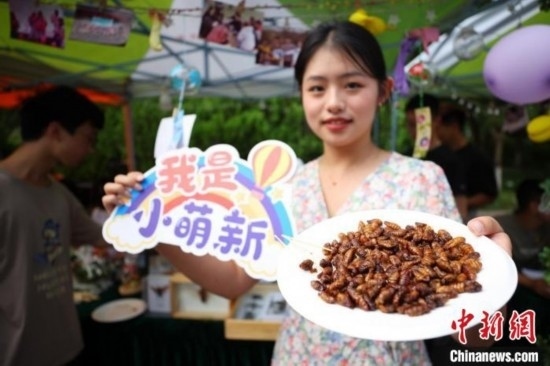 南京農(nóng)業(yè)大學(xué)植保學(xué)院志愿者展示可食用的昆蟲迎接新生。泱波 攝
