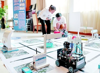 上海電子信息職業(yè)技術(shù)學(xué)院的師生展示智能機(jī)器人創(chuàng)新開(kāi)發(fā)項(xiàng)目。 新華社發(fā)