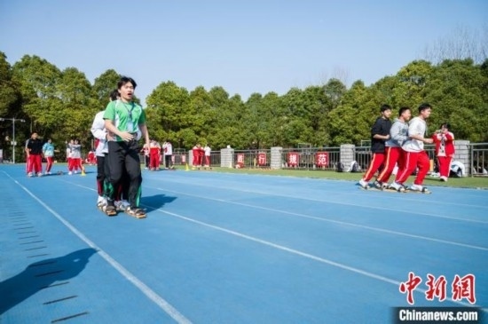 3月19日,香港學(xué)生體驗(yàn)少數(shù)民族傳統(tǒng)體育項(xiàng)目《板鞋競(jìng)技》。唐哲 攝