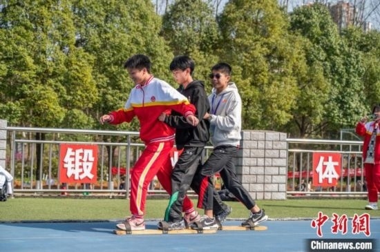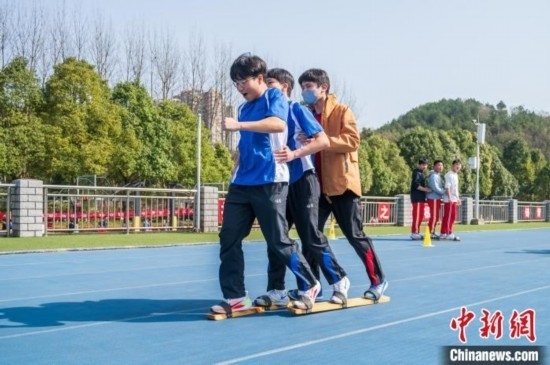 3月19日,兩地學(xué)生一起體驗(yàn)少數(shù)民族傳統(tǒng)體育項(xiàng)目《板鞋競(jìng)技》。唐哲 攝