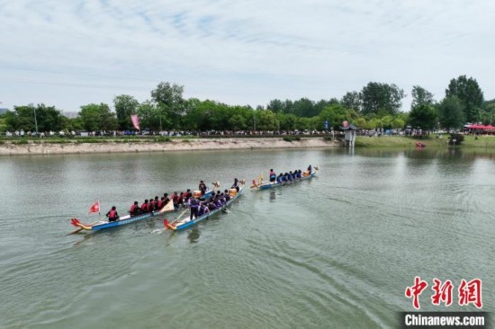 5月2日,來自長三角地區(qū)的12所高校的龍舟隊齊聚安徽肥西,展開了一場龍舟競技。(無人機照片)陳家樂攝