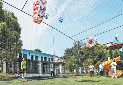 | 航模隊(duì)隊(duì)員在操場上進(jìn)行無人機(jī)足球?qū)官?。李桂東攝(人民視覺) |