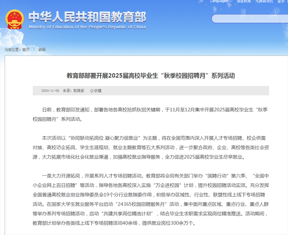 記者11月6日從教育部獲悉,教育部近日印發(fā)通知,部署各地各高校搶抓秋招關(guān)鍵期,于11月至12月集中開(kāi)展2025屆高校畢業(yè)生“秋季校園招聘月”系列活動(dòng)。