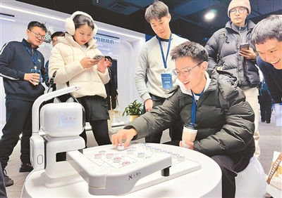 在位于北京亦莊的兩岸科創(chuàng)中心,張朝宣與一款名為“元蘿卜”的象棋機器人對弈,引得眾人圍觀。他說:“這是我第一次和AI下棋,很有趣。我每下一步,它都可以推算出它的勝率是多少,從而讓我及時知道哪步好或不好,能幫助我提高棋藝。”