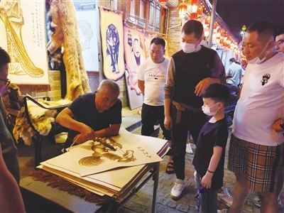 在老街上一些具有民族特色的皮畫店、皮包店也成為了人們駐足消費、觀賞的熱點商鋪。在一家皮畫店,皮畫師在現(xiàn)場制作皮畫,看著精美的圖案被皮畫師一筆一筆地勾勒出來,不少市民都忍不住停下腳步?!皫Ш⒆映鰜黹e逛,看到皮畫孩子主動提出來要看,皮畫是咱們呼市特有的,現(xiàn)場制作,能讓更多人了解制作過程,了解皮畫,挺好的。”市民周先生說。