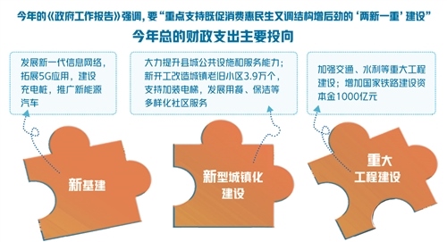 為重點(diǎn)支持既促消費(fèi)惠民生又調(diào)結(jié)構(gòu)增后勁的“兩新一重”建設(shè),根據(jù)《政府工作報(bào)告》,今年特別安排地方政府專項(xiàng)債券3.75萬億元,比2019年有所增加;另有抗疫特別國債1萬億元,資金用途共涉及6個(gè)領(lǐng)域,其中有部分也指向“兩新一重”建設(shè)領(lǐng)域。