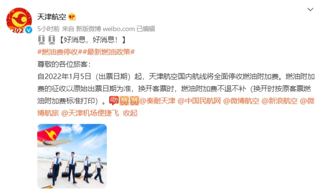 今日,中國國際航空、海南航空、天津航空、西部航空等多家航空公司發(fā)布通知,根據(jù)國家發(fā)展改革委、民航局的相關文件精神,自2022年1月5日零時起(出票日期),取消征收國內(nèi)航線燃油附加費。