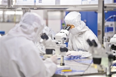 工人在包頭江馨微電機科技有限公司數(shù)字化百級無塵車間趕制配套5G手機產(chǎn)品的音圈馬達。