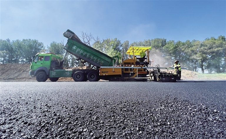 8月5日,施工人員正在鋪設瀝青。記者從中國二冶集團內(nèi)蒙古分公司和林格爾新區(qū)金盛快速路北段-杭蓋路連接線項目部了解到,該項目正在鋪設瀝青,同時進行智能交通以及道路交通標識標線施劃等工作,施工完畢后將于近日通車。該路段通車后,將有效緩解呼和浩特南部城區(qū)出城交通壓力,方便群眾出行。(記者 孟和朝魯 攝)