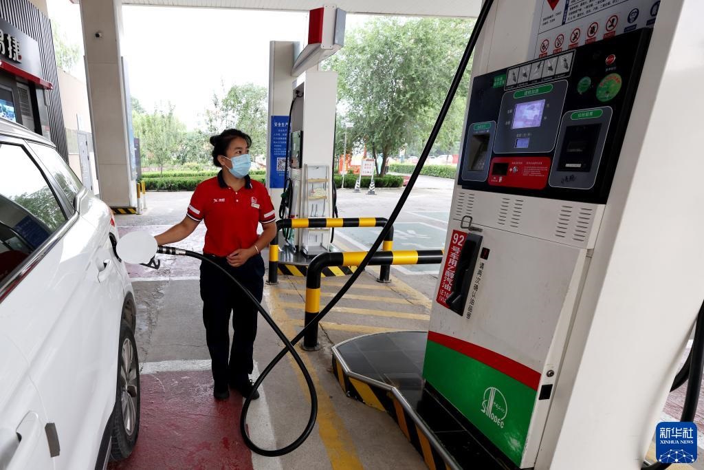 8月9日,江蘇無錫一加油站工作人員給汽車加油。新華社發(fā)(還月亮 攝)