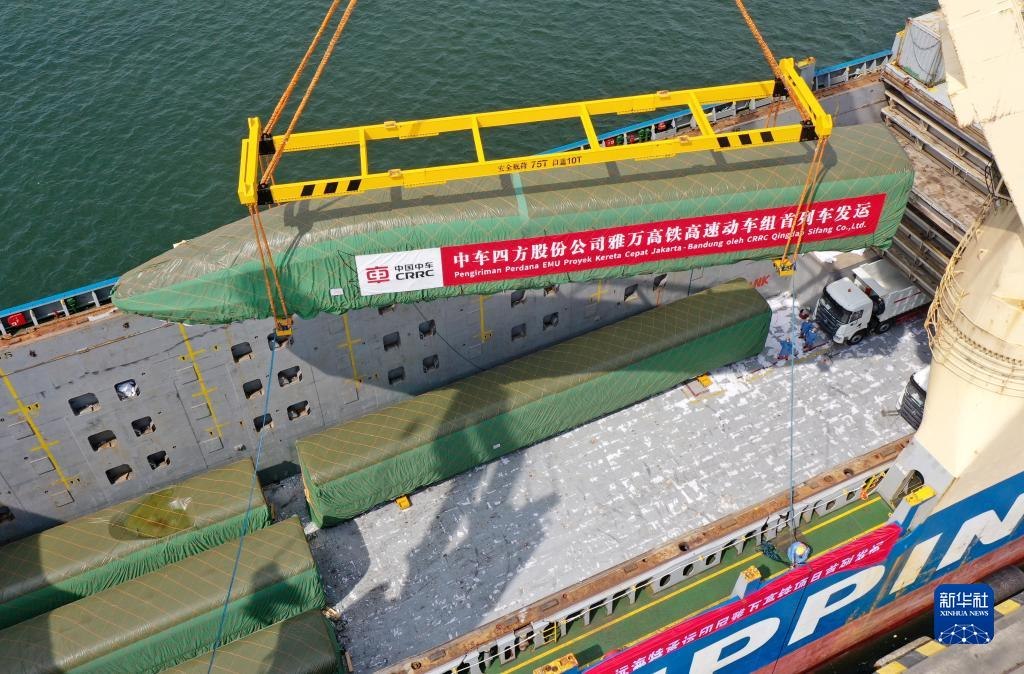 雅萬高鐵高速動車組在山東港口青島港裝船(8月18日攝)。新華社發(fā)(姜超 攝)