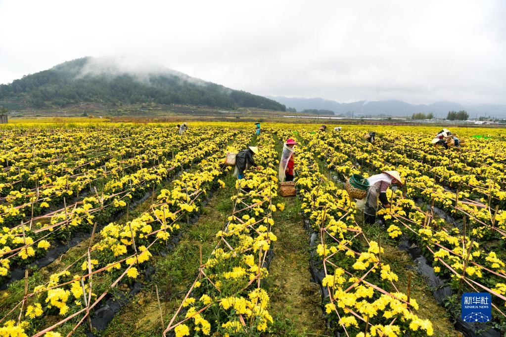 金秋時(shí)節(jié),貴州省黔南布依族苗族自治州貴定縣云霧鎮(zhèn)種植的1000余畝菊花陸續(xù)進(jìn)入采摘期,當(dāng)?shù)卮迕衩χ烧?、分揀、烘干菊花,供?yīng)市場(chǎng)。