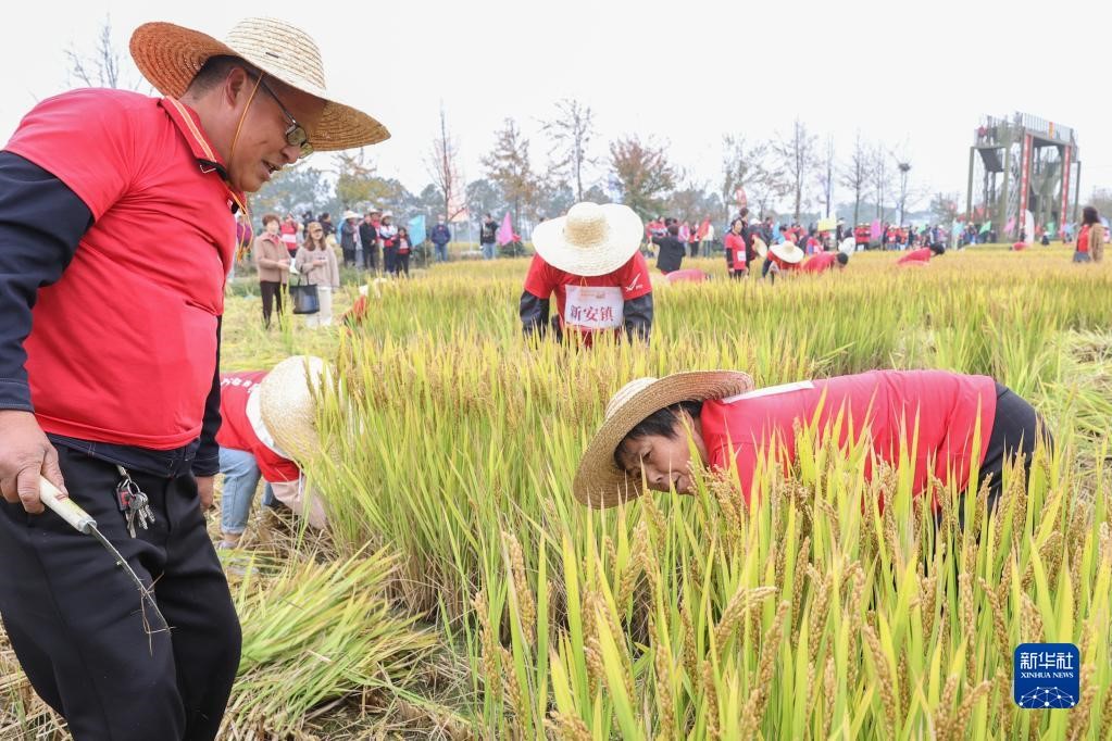 11月15日,在德清縣舉辦的美好家園運(yùn)動(dòng)會(huì)暨新安鎮(zhèn)稻田爭霸賽上,村民參加割稻比賽。新華社發(fā)(姚海翔 攝)