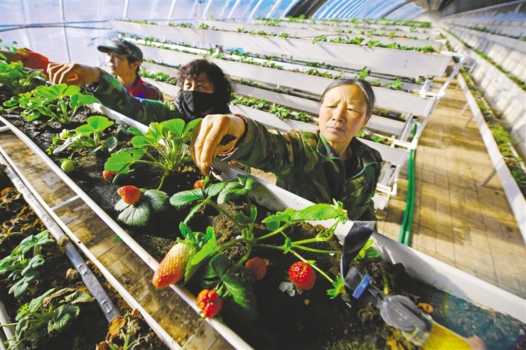 春節(jié)期間,蘇尼特右旗賽漢塔拉鎮(zhèn)扶貧產(chǎn)業(yè)園區(qū)的日光大棚里,菜農(nóng)們正在采摘立體種植的草莓。當?shù)攸h委政府引導(dǎo)居民整合土地建設(shè)日光溫室大棚,以“土地入股企業(yè)分紅”“承包大棚按企業(yè)要求種植”“務(wù)工就業(yè)”等方式實現(xiàn)增收致富。(記者 王曉博 攝)