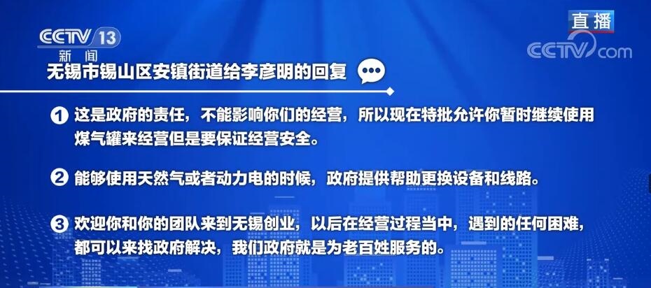 白巖松:首先我們來看看安鎮(zhèn)街道給李彥明的回復(fù)當中的一些關(guān)鍵詞,第一個,這是政府的責(zé)任,不能影響你們的經(jīng)營。第二個里頭包括能夠使用天然氣或者動力電的時候,政府提供幫助更換設(shè)備和線路。在第三里頭有我們政府就是為老百姓服務(wù)的。咱們接下來馬上連線一下當事人,無錫市錫山區(qū)安鎮(zhèn)街道商務(wù)科的科長鄒祎,就是他幫著辦的這個事情。鄒科長您好!您當然感受得到您火了,在網(wǎng)上也被網(wǎng)友表揚,我特別想知道您的領(lǐng)導(dǎo)表揚您沒有?