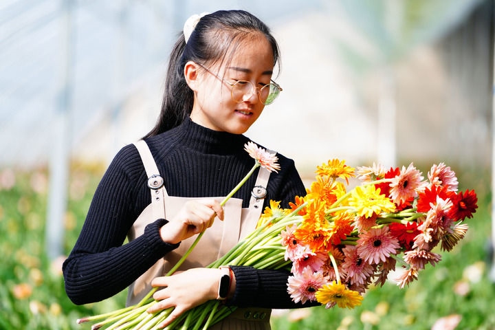 位于沂蒙革命老區(qū)的莒縣招賢鎮(zhèn)扶郎花生產(chǎn)基地,工作人員在整理扶郎花。
