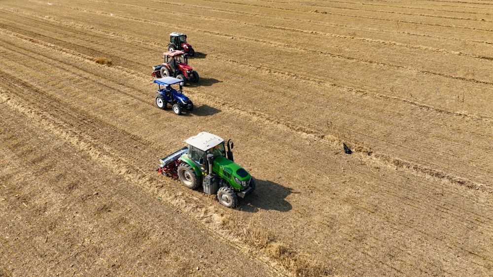 樂陵市來秋農(nóng)機(jī)服務(wù)專業(yè)合作社的四臺(tái)新式追肥機(jī)正在麥田進(jìn)行追肥作業(yè)。