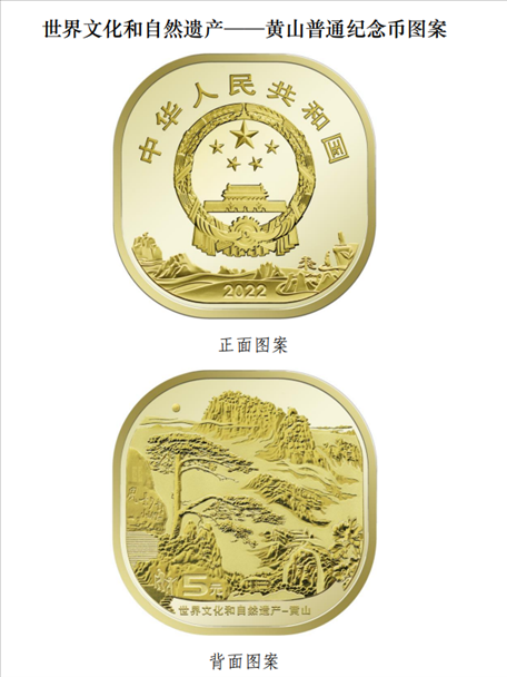 世界文化和自然遺產(chǎn)——黃山普通紀(jì)念幣正面圖案為中華人民共和國國徽,國徽上方刊“中華人民共和國”國名,下方為裝飾風(fēng)格的黃山圖案并刊年號“2022”字樣;背面主景圖案為迎客松和黃山山峰等,主景圖案下方刊“世界文化和自然遺產(chǎn)——黃山”字樣和面額“5元”字樣。