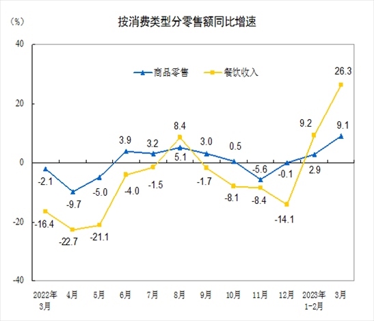 按消費(fèi)類型分,3月份,商品零售34148億元,同比增長(zhǎng)9.1%;餐飲收入3707億元,增長(zhǎng)26.3%。1—3月份,商品零售102786億元,同比增長(zhǎng)4.9%;餐飲收入12136億元,增長(zhǎng)13.9%。