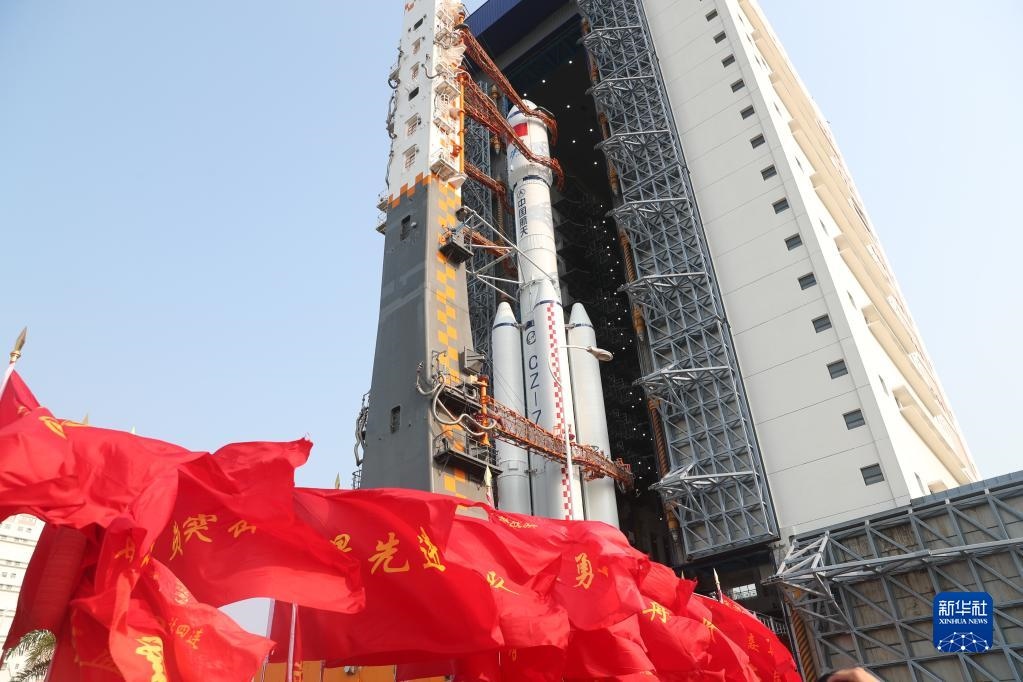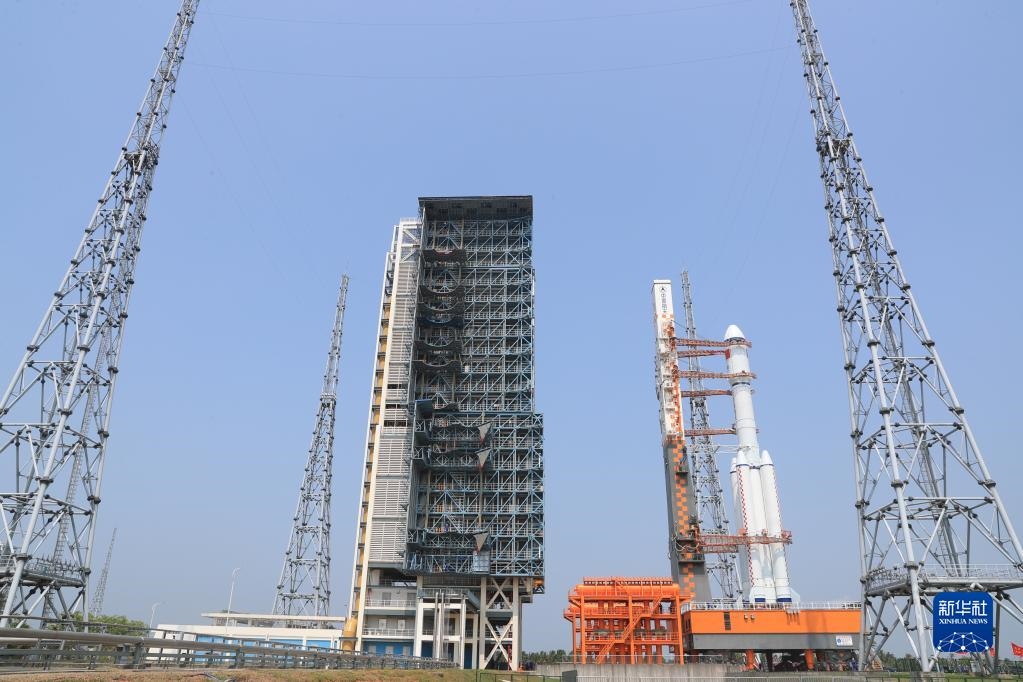 5月7日,天舟六號貨運(yùn)飛船與長征七號遙七運(yùn)載火箭組合體垂直轉(zhuǎn)運(yùn)至發(fā)射塔架。新華社發(fā)(黃國暢 攝)