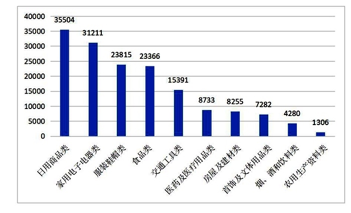 在商品類投訴方面,數(shù)據(jù)顯示,日用商品類、家用電子電器類、服裝鞋帽類、食品類和交通工具類投訴量居前五位。與2022年一季度相比,醫(yī)藥和醫(yī)療用品類投訴量比重上升1.69個百分點(diǎn),食品類投訴量比重下降1.84個百分點(diǎn)。