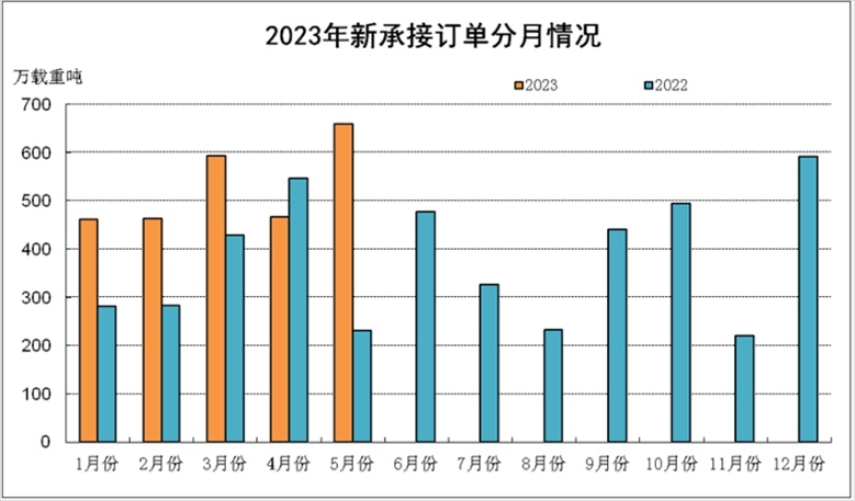 2023年1-5月新承接訂單分月統(tǒng)計(jì)。 來(lái)源:中國(guó)船舶工業(yè)行業(yè)協(xié)會(huì)