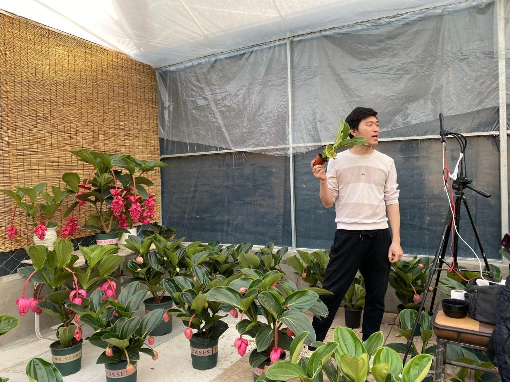 李莎莎的花卉大棚內(nèi),主播正在直播銷(xiāo)售寶蓮燈花。新華社記者 陳國(guó)峰 攝