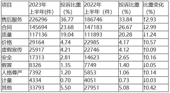 與2022年上半年相比(如表1所示),售后服務(wù)、價(jià)格問題投訴比重上升較多,合同、質(zhì)量問題投訴比重下降明顯,其余類投訴變化幅度較小。