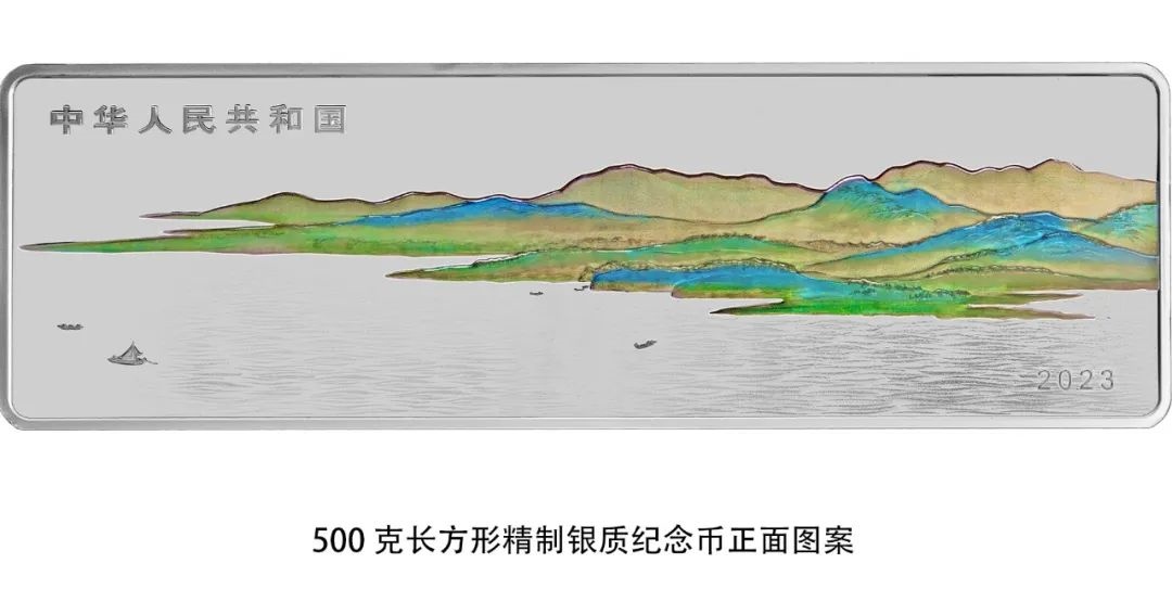 500克長方形銀質(zhì)紀(jì)念幣正面圖案為山、水等組合設(shè)計(jì),并刊國名、年號。