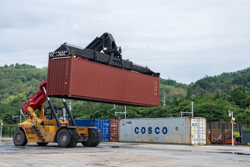 6月20日,在株洲中車物流園,工作人員在進行集裝箱裝車作業(yè)。新華社記者陳思汗攝