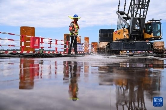 6月21日,中鐵建大橋局施工人員為萬龍大橋主墩樁基作業(yè)平臺(tái)澆水降溫。