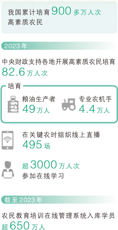 目前,我國累計培育900多萬人次高素質農民。嘗鮮新技術、涉足新業(yè)態(tài),一批批高素質農民積極擁抱專業(yè)化、規(guī)?;藴驶默F代經營理念,為農業(yè)農村發(fā)展保持穩(wěn)中向好態(tài)勢提供了有力支撐。