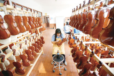 2000年左右,東高村鎮(zhèn)借助提琴產(chǎn)業(yè)和人力資源優(yōu)勢,將初期的小作坊模式逐步發(fā)展為集群樂器企業(yè)模式,把提琴產(chǎn)業(yè)這把“火”燒得越來越旺。到2008年,世界上每10把小提琴,便有3把來自這個小鎮(zhèn)。每年生產(chǎn)的近30萬把提琴,通過集裝箱,漂洋過海,銷往全球40多個國家和地區(qū)。
