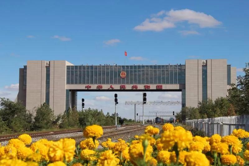 國門莊嚴(yán)肅穆,在國門乳白色的門體上方嵌著"中華人民共和國"7個鮮紅大字,上面懸掛的國徽閃著的金光,國際鐵路在下面通過。國門下方的中蒙鐵路,是連接首都北京和烏蘭巴托、莫斯科的鐵路交通大動脈,被譽為“歐亞大陸橋”。