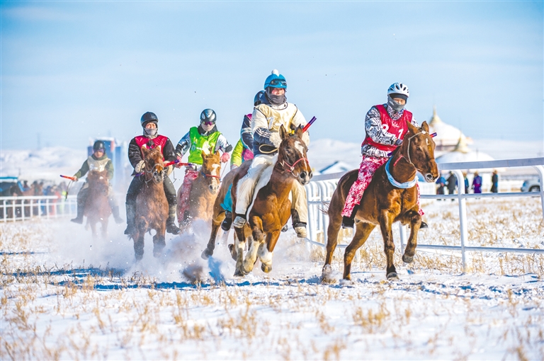 1月18日,錫林浩特市那達(dá)慕風(fēng)情園內(nèi)馬蹄踏雪、人聲鼎沸,“歌游內(nèi)蒙古·暢享錫林浩特”——冬季那達(dá)慕暨蒙古馬超級聯(lián)賽在歡騰的歌聲中拉開序幕。開幕式上,隨著馬蹄的噠噠聲,一支雄壯的馬隊(duì)踏雪而來,騎手們身著艷麗的蒙古袍,駕馭著矯健的蒙古馬,以整齊的隊(duì)列自遠(yuǎn)處緩緩走來。歌聲悠揚(yáng),舞姿豪邁,演員們以動人的演繹,完美詮釋了力量與藝術(shù)之美。本次賽事包含15公里耐力賽、10公里3人團(tuán)體接力賽、跑馬射箭、跑馬拾哈達(dá)、6公里走馬及搏克比賽等比賽項(xiàng)目。賽場上,騎手們馭馬飛馳,人與馬默契配合,在銀裝素裹的雪原上縱橫馳騁。在跑馬射箭與跑馬拾哈達(dá)項(xiàng)目上,騎手在飛奔的馬匹上挽弓搭箭、俯身拾物,動作行云流水,精湛技藝引來觀眾陣陣驚呼與贊嘆。除了扣人心弦的比賽,本次活動還為游客打造了豐富的冰雪互動體驗(yàn)。冰雪涮肉宴香氣四溢,草原篝火電音派對將熱情推向高潮,千人雪戰(zhàn)、雪地拔河等趣味項(xiàng)目讓游客親身參與,盡情享受冰雪樂趣?,F(xiàn)場還同步舉辦了錫林浩特“伊德喜”草原冬儲肉展銷活動,讓游客在觀賽之余,還能選購到正宗錫林郭勒牛羊肉,體驗(yàn)純正的草原風(fēng)味。(記者 巴依斯古楞 通訊員 崔巍光 攝影報(bào)道)
