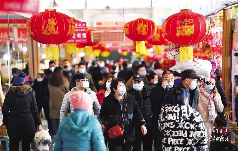 2月7日,呼和浩特市民在保全莊農(nóng)貿(mào)市場購買年貨。春節(jié)日益臨近,首府超市、市場內(nèi)各類年貨琳瑯滿目,前往采購年貨的市民絡(luò)繹不絕,年貨銷售迎來高峰。據(jù)了解,呼和浩特市肉蛋果蔬、米面糧油等生活必需品貨源充足、品種豐富,滿足廣大市民的消費(fèi)需求。內(nèi)蒙古日報(bào)社融媒體記者 孟和朝魯 攝