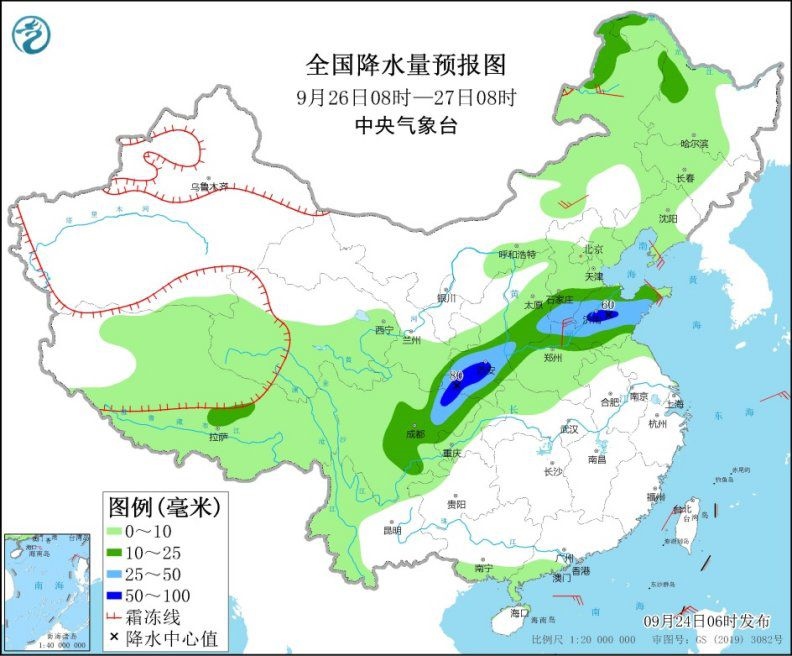 9月24日08時(shí)至25日08時(shí),西北地區(qū)東部、華北大部、黃淮中北部、海南島等地部分地區(qū)有中到大雨,其中,陜西中南部、華北南部、山東西部、河南北部、海南島東南部等地部分地區(qū)有暴雨或大暴雨(100~140毫米)。新疆南疆盆地等地部分地區(qū)有4~6級風(fēng),新疆東部部分地區(qū)有8~9級風(fēng)。