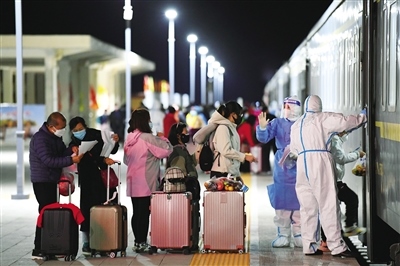 10月30日晚,又一批符合條件的滯留游客搭乘火車離開額濟(jì)納旗轉(zhuǎn)運(yùn)至低風(fēng)險(xiǎn)地區(qū)。記者 王磊 見習(xí)記者 王坤 攝