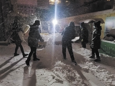 下雪期間,明仁街道再次啟動應(yīng)急除雪預(yù)案,街居干部和除雪機(jī)械全部到崗,小區(qū)物業(yè)、沿街商戶、居民群眾也被發(fā)動起來,除雪大隊化整為零,分赴重點(diǎn)片區(qū)和社區(qū),從早上7點(diǎn)到夜幕沉沉,不分晝夜迎戰(zhàn)風(fēng)雪。