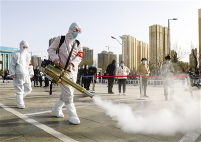 志愿者對(duì)戶(hù)外通道進(jìn)行消殺