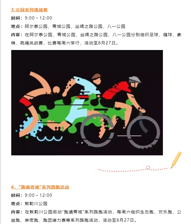 本次運動會認真踐行“以人民為中心”辦賽理念,創(chuàng)新探索聚集少、規(guī)模小、符合大眾運動口味的內(nèi)蒙古賽馬場城市三項賽,包含跑步3000米、跳繩200個和動感單車騎行5公里3個項目比賽。此外,還將舉辦公園系列挑戰(zhàn)賽、“跑遍青城”系列路跑活動等,讓群眾在暢享運動的過程中盡情領略城市綠景的清新曼妙,進一步推動全民健身與全民健康深度融合。