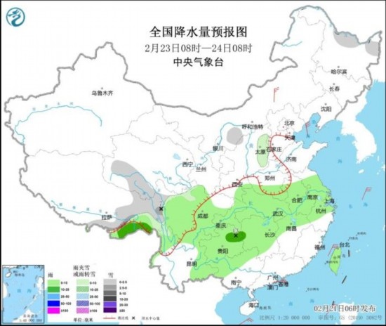 全國(guó)降水量預(yù)報(bào)圖(2月23日08時(shí)-24日08時(shí))。圖片來(lái)源:中央氣象臺(tái)網(wǎng)站