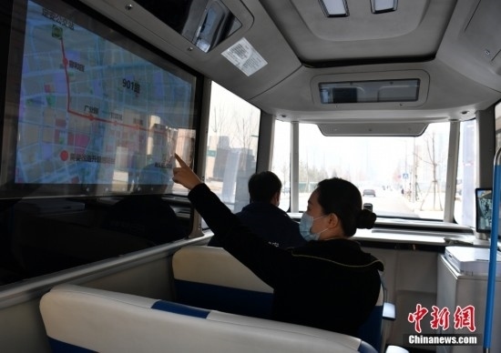 2月22日,智能網(wǎng)聯(lián)巴士901線測試車輛測試員正在介紹公交路線。雄安新區(qū)的智能網(wǎng)聯(lián)巴士近期正在進(jìn)行投入運(yùn)營前的道路測試,該巴士配備了超高感度攝像頭、超聲波雷達(dá)、激光雷達(dá)、毫米波雷達(dá)等感知設(shè)備,組成了車輛的“眼睛”。車輛可自主識別紅綠燈、道路提示牌和車道標(biāo)線等,做出跟車、超車、停車等動(dòng)作。中新社記者 韓冰 攝