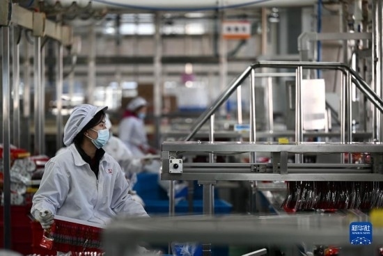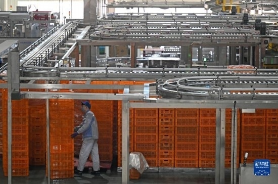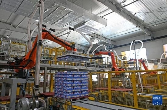 在天津海河乳品有限公司智能化生產(chǎn)線,智能生產(chǎn)設備在轉運貨物(2月20日攝)。