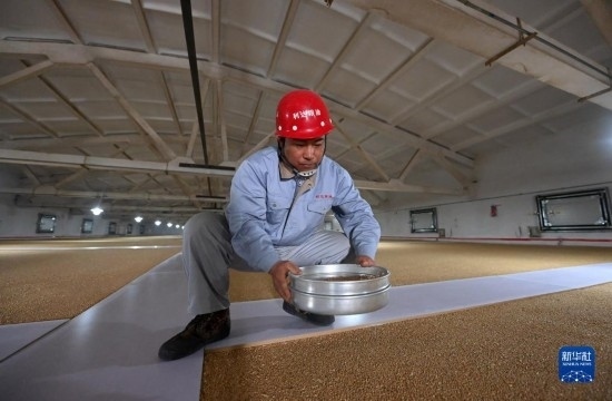 在天津利達糧油有限公司原糧倉,工作人員查看糧食儲藏情況(2月23日攝)。