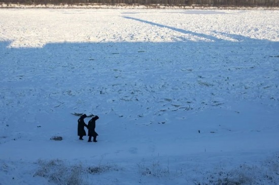 “慢點(diǎn)走,這雪地看著平整,下面還有一層冰?!笔废葟?qiáng)一邊說一邊攙著沈欣慢慢走。沿著江堤一路下坡,走到頭就是黑龍江,江面中間插著國旗標(biāo)識(shí)國界。