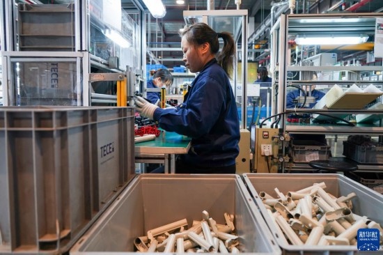 工人在位于太倉(cāng)市高新區(qū)的帝希潔具系統(tǒng)(蘇州)有限公司生產(chǎn)車間內(nèi)進(jìn)行加工作業(yè)(3月16日攝)。