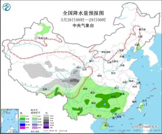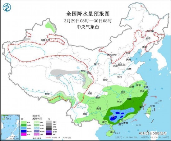 3月28日08時(shí)至29日08時(shí),西藏北部和東部、青海東部、川西高原中北部等地部分地區(qū)有小雪或雨夾雪,其中,西藏東北部、川西高原北部等地部分地區(qū)有中到大雪。西藏東南部、江南大部、西南地區(qū)大部、華南等地部分地區(qū)有小到中雨,局地有大雨(見(jiàn)圖2)。